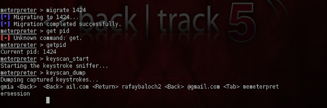 In this case I am using metasploit framework from backtrack 5, Backtrack 5 is an awesome linux distro which is specially dedicated to hackers and penetration testers, I have used Social Engineering Toolkit to utilize a browser autopwn in order to open up a meterpreter session on the victims computer. Step 1 - Before we start the keylogger and start capturing logs, we would need to migrate explorer.exe process as we don't want the our exploit to get closed, In order to migrate the process we would need the PID of the process, In order to get the PID type "PS" on the command line. Step 2 - Once you know the exact process PID type "Migrate" command along with with the PID so incase if the PID is 1372, you will type "Migrate 1372" Step 3 - Now just type "Keyscan_start" to start the keylogger. Step 4 - Now just sit back and relax, In order to harvest keystores all you need to do is type the "Keyscan_dump" command. ====================================================================