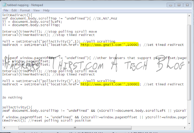 Concept of phishing and Tab napping : In previous times hackers used to create fake login pages of many popular sites and hosted that pages to any hosting sites such as t35,110mb and also 000webhost. Then the thing was to spread the link and to send that link to the victim Via email spoofing or something else. ( I used to do that by shortening a Url ) . But with the updated browsers and more security that way is out of this world now. But in May 2010 , A mozilla employee outlined a sly new attack tactic dubbed "tabnapping" that can dupe users into giving up passwords by secretly changing already-open browser tabs. Yes that is possible that you can change the already opened tabs in any browser by using a small script. The is that people browse now a days by using tabbed browsers and sometimes the open ( Me too) a lot of tabs and then forget to go to others tab or often they don't find time to do so. We may call it as an idle tab, So fortunately or unfortunately we can redirect that idle tab to any phishing page. So that is a basic concept of Tab napping. Here, i am showing a tutorial that how hackers make it possible : Almost all the tabbed browsers are vulnerable to this attack. Note: All the short description shown is for educational purpose. First of all you may need a free hosting also for this purpose. I shall suggest you t35 , 110mb. Now you must have a basic knowledge of creating html ( For learning html go to www.w3schools.com) pages or if you don't have then don't worry. You may select a hot news page or any headline or else a popular page. Just select its source code and make a duplicate of it. Use dreamweaver or Notepad++. And you change the headings there. and also a bit content at that page. So, We may call it page A. Now, We have to make that tab napping exploit and insert that in page A . I have created a one. You may download it below : Download Exploit (On clicking this link skip the add from uper top right corner) Now, You will have to create a B page (that is the phishing page { learn how to make a phishing page}). and you should insert the above script in page A. Now you have to send the page A link to the victim and when he opens it. He may open other tabs and when this tab of page A will become idle the victim will be redirected to your phishing page ( You will specify time in script ). How to insert exploit in Page A or original page(May contain Hot news,Something fascinating) URL in script : You have to replace above highlighted portions to your own phishing page Url or a cookie stealing Url inorder to hack his/her acount. And thats it. Page A upon becoming idle will redirect to page B (the phishing page) In my script i specified 10 sec to redirect on becoming idle. So, thats the trick that hackers use. How to prevent tab napping : While using tabbed browsing and going to other tabs do look at the url shown above. Or else you will login to a facebook or orkut etc phishing page and you will login thinking that you have opened it. Use latest Nod 32 personal security version. You may search this blog to get it for free. JavaScript